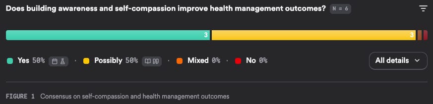 What I found interesting when doing the research on self compassion, was the limited amount of research and yet the consensus is quite balanced. I mean who doesn’t want to take a fifty / fifty chance on something if it doesn’t add more effort than just being as kind to yourself as you are to close friends. The following consensus question demonstrates the possibility.